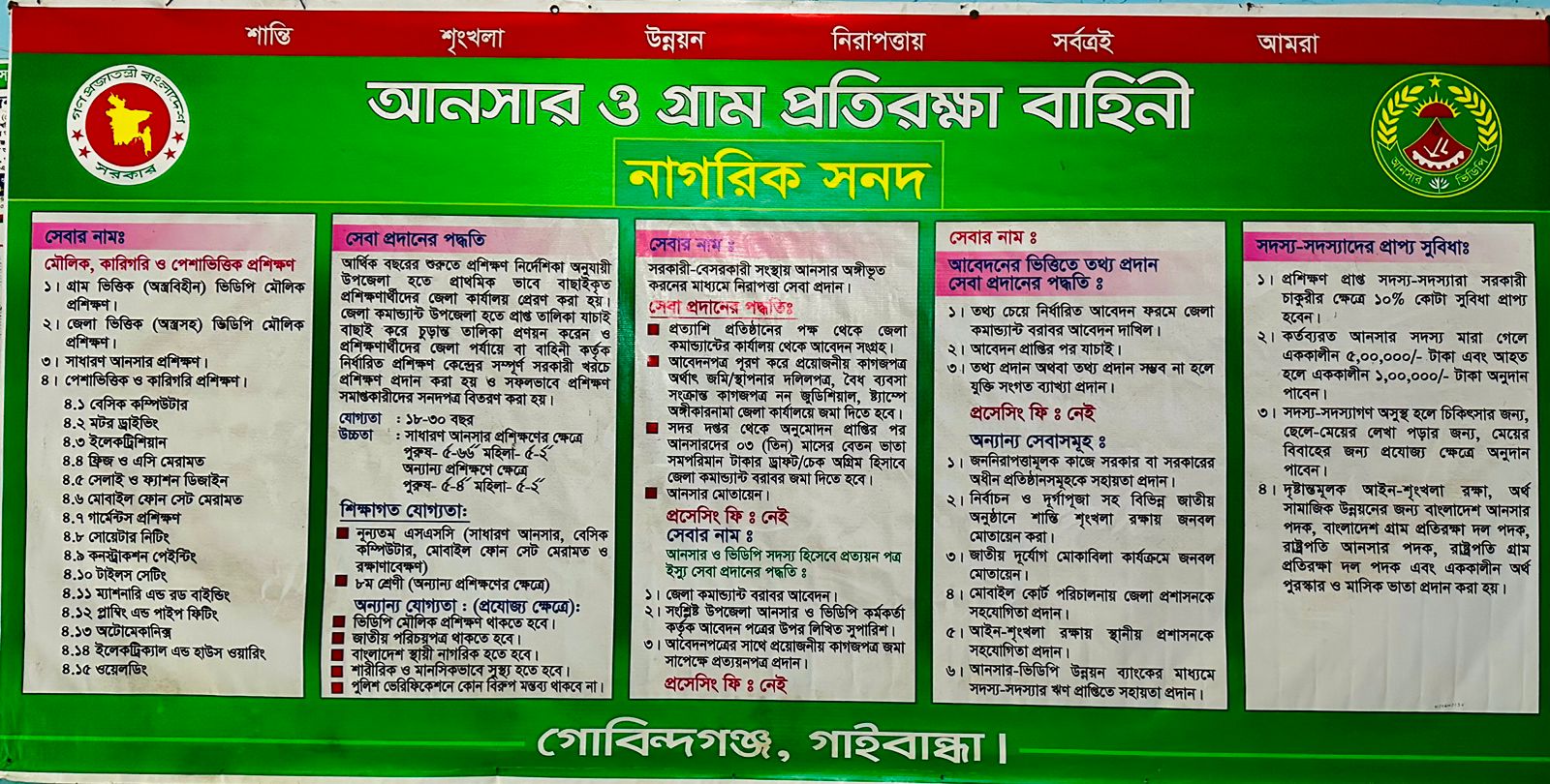 আইন শৃঙ্খলা রক্ষায় পুলিশ বাহিনীকে সহযোগিতা করা। যেমনঃ- জাতীয় ও স্থানীয় নির্বাচন, দূর্গাপুজায় যোগ্যতা সম্পন্ন আনসার ও ভি.ডি.পি বাছাই ও নিয়োগ প্রদান।